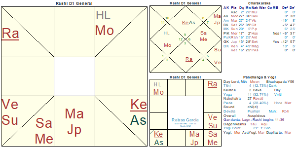 For the Umbrella to open we need at least one planet in the 6th, one in 7th and one in 8th bhava from the Moon. Umbrella is in your hand and it is upto you to open it. But often you do not have the strength. See the focus of the umbrella. This is the 10th house with 10L Mercury exalted there in a siṁhāsana yoga with Saturn. So the one who can energize you to open is the deity associated with the 10th house. Note 10H is opposite her Moon in 4H. And we have learnt that the devata for this bhava is Viṣṇu (Kendra) » Nṛsiṁha (10H). All she needs is a Nṛsiṁha mantra and voila, the umbrella opens.